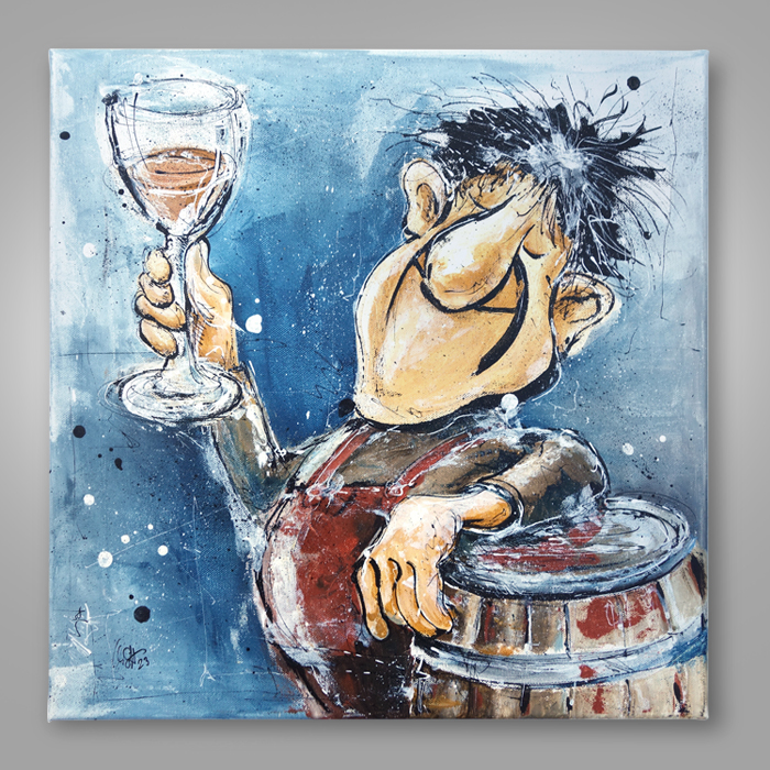 Humorvolle Inszenierung eines Winzers, der mit geschlossenen Augen sein Glas erhebt.