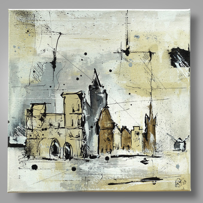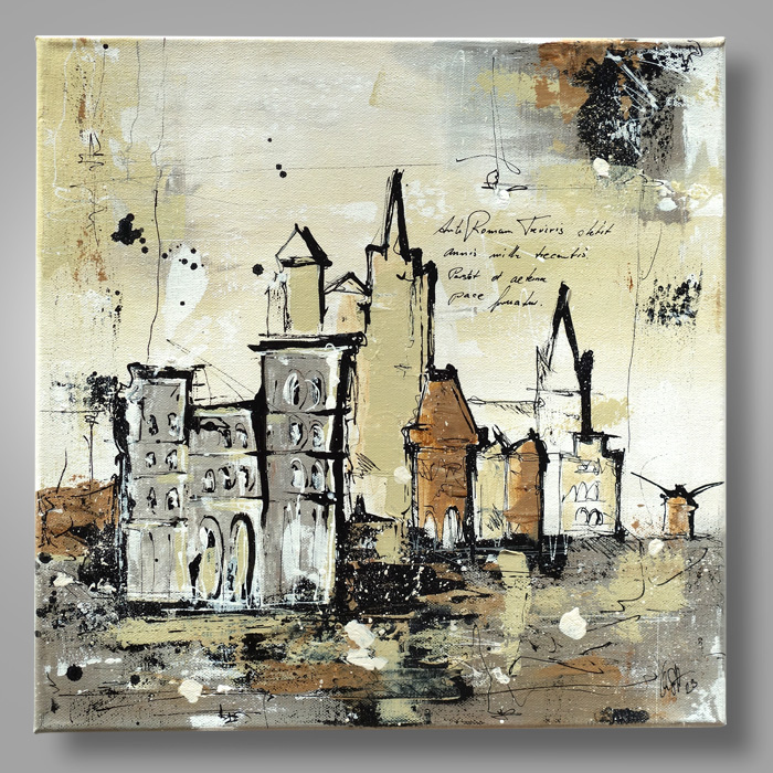 Nichts scheint real, lockere Umrisse, diffuse Farbflächen - extrem abstrahiert und doch erkennbar. Ein Spiel mit den Silhouetten Trierer Gebäude, reduziert bis auf einen symbolhaften Kern in einem surreal zweidimensionalen Raum.