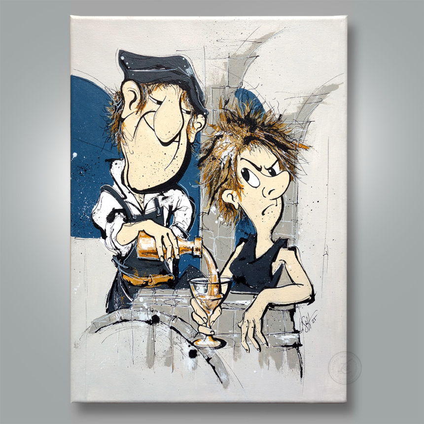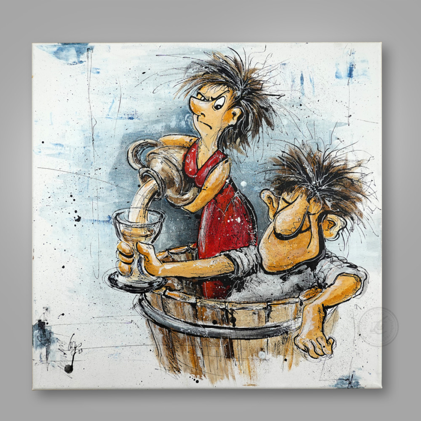Humorvolle Inszenierung einer Sektverkostung vor angedeutetem Gewölbekeller. Im Gegensatz zum Gemälde "Weinprobe" lässt sich hier die Dame ein Gläschen vom Kellermeister einschenken.