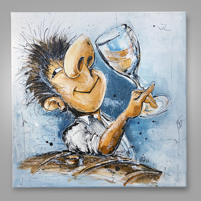 Humorvolle Inszenierung einer Weinprobe.