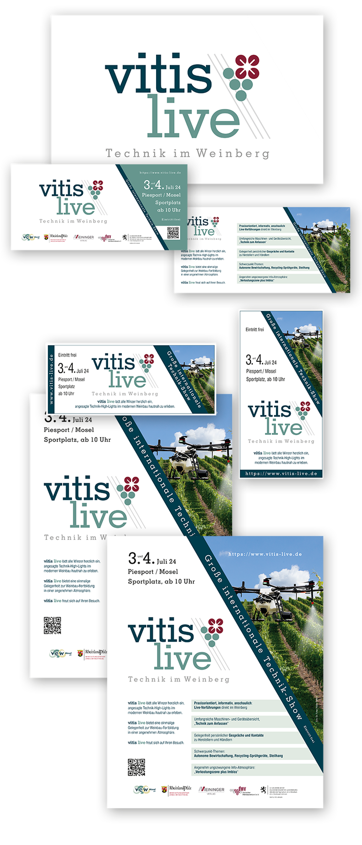 Die schrägen Linien stehen für die Zeilen eines Weinbergs, die Traube transportiert das Thema "Wein" und die roten Kreise mit einem gekippten Kreuz stellen eine Drohne dar, als "Pars pro Toto" moderner Technik. Die Farbgebung leitet sich vom VEW-Mosel her, des Messeveranstalters.